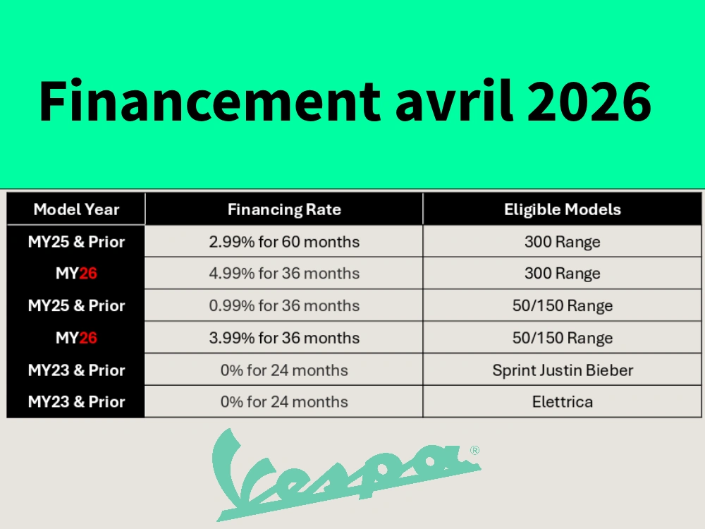 Profitez, pour une durée limitée, d’offres exceptionnelles avec un taux d’intérêt annuel de 0,99 % sur 36 mois sur certains modèles de Vespa.